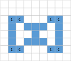 그런데 화면에서 나타난 얼음의 모양은 작은 정사각형 모양의 4변 중에서 적어도 2변 이상이 외부의 공기와 접촉했을 때 정확히 한 시간 만에 녹아 없어져 버린다. 따라서 위 그림의 모양과 같은 얼음(파란으로 표시된 부분)라면 C로 표시된 모든 얼음 격자는 한 시간 후에 사라진다.